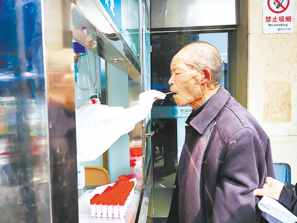 市救助站工作人员给老人做核酸检测。