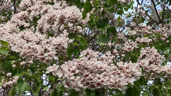 楸树花朵形状如钟,花簇错落在翠绿的枝叶间,粉花绿叶,清雅非常。偶有风来,枝摇花动,引出淡淡香气。