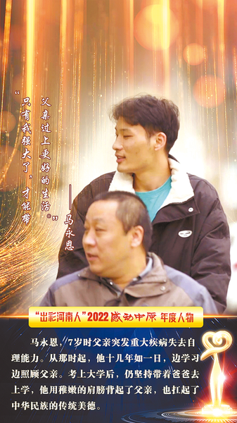 驻马店网讯(记者 刘金霞)用凡人伟力坚守初心,用点滴善行春风化雨。4月12日晚,“出彩河南人”2022感动中原年度人物揭晓,10组温暖人心的河南好人与一个模范集体获此殊荣。其中,践行孝老爱亲、带着瘫痪父亲在黄河科技学院应用技术学院上学的我市平舆县学生马永恩上榜。