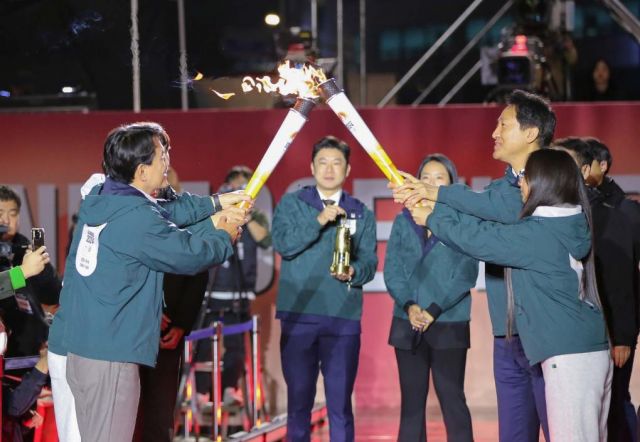 10月11日,首尔市长吴世勋(右二)与江原道知事金镇台(前左一)参与火炬传递。新华社记者 姚琪琳 摄