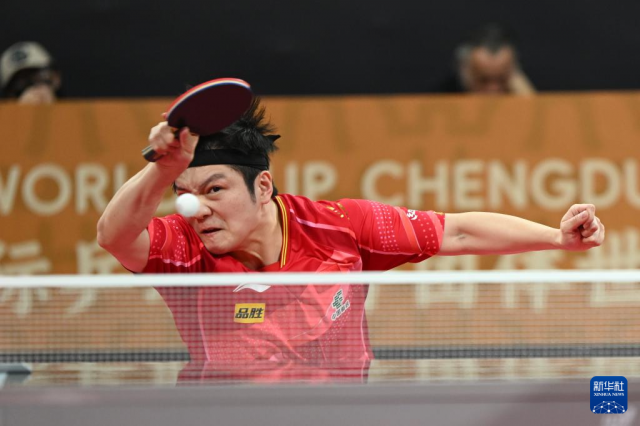 12月7日,中国队选手樊振东在男单比赛中回球。他以2比1战胜法国队选手费利克斯·勒布伦。新华社记者 胥冰洁 摄