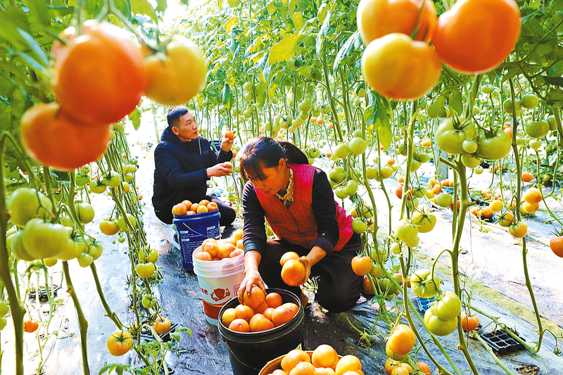 12月21日,在驿城区水屯镇田庄村的蔬菜基地,大棚里的西红柿相继成熟,前来帮工的居民正在采摘、装箱、过磅,大棚里一片丰收的景象。