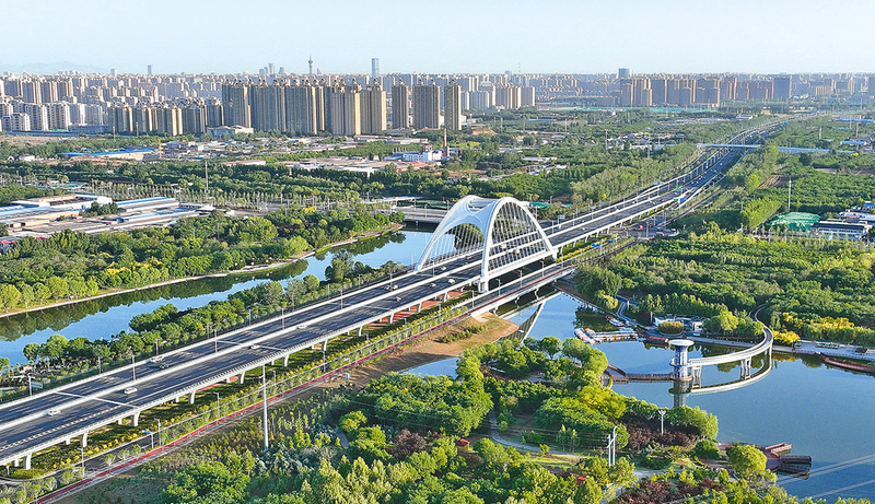 这是5月15日拍摄的河北省石家庄市复兴大街泊水公园特大桥(无人机照片)。近年来,河北省石家庄市积极推动城市路网交通体系建设,通过打造完成复兴大街和北三环市政化改造等项目,拉开城市发展框架,形成外通内畅、转换高效、区间融合的城市路网新格局,提升了城市道路通行能力和城市形象。 新华社发