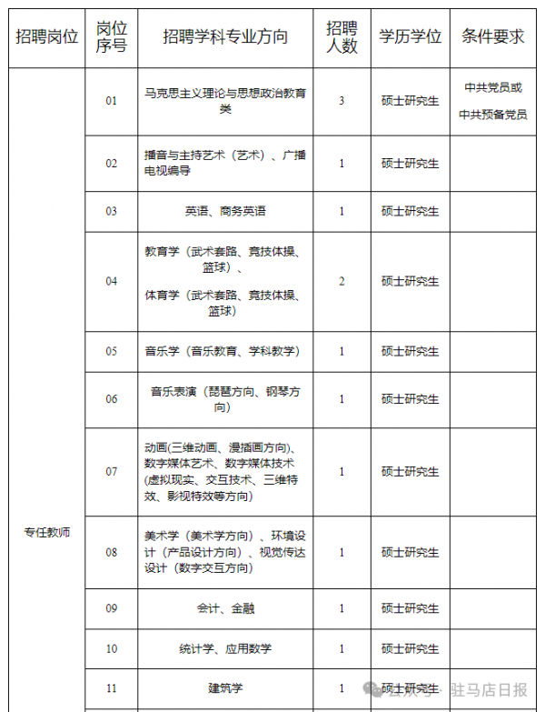 详见《黄淮学院2024年硕士专任教师招聘计划表》(附件)。