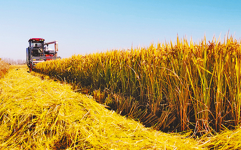 近日,确山县留庄镇禾盛生态农业发展有限公司举办禾盛农业第二届香粳水稻丰收节。沉甸甸的稻穗挂满了稻秆,稻田间弥漫着清新的稻香,收割机在田间来回穿梭收割稻谷,一派丰收的农忙景象。