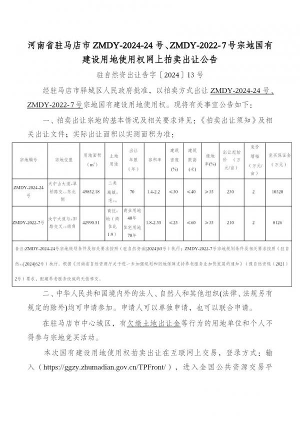 河南省驻马店市ZMDY-2024-24号、ZMDY-2022-7号宗地国有建设用地使用权网上拍卖出让公告