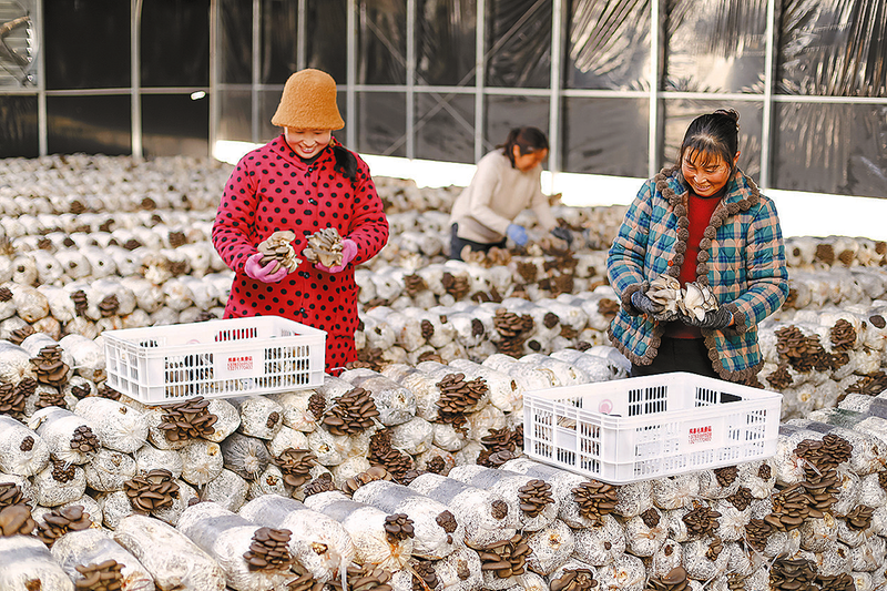 近日,在正阳县熊寨镇毛集村蘑菇种植产业园,村民正在采摘蘑菇。该村从小规模种植发展成为如今规模化、产业化的蘑菇种植产业园,有效推动村集体经济和农民增收,助力乡村振兴。