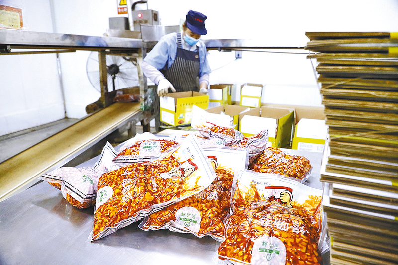 12月28日,在正阳县先进制造业开发区河南中坤农业科技有限公司生产车间,工人正在加工、包装咸菜。