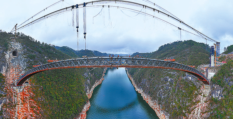 合龙后的乌江特大桥(3月5日摄,无人机照片)。3月5日,贵州瓮马铁路南北延伸线项目控制性工程乌江特大桥顺利合龙。乌江特大桥全桥长约520米,主跨337米,桥面至江面高度约200米。瓮马铁路南北延伸线北起瓮安延伸至遵义,南起马场坪延伸至都匀,全长148公里。 新华社记者 刘 续 摄