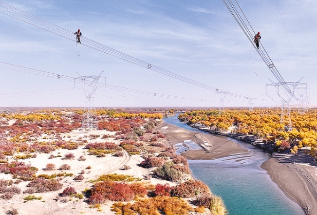 7月13日,在塔里木盆地南缘的新疆和田地区民丰县,随着牵引机将最后一段电线成功从183号铁塔拽至188号铁塔,标志着历时15年建设的环塔里木盆地750千伏输变电工程全线贯通,形成了一条围绕塔里木盆地的750千伏超高压输电环网。