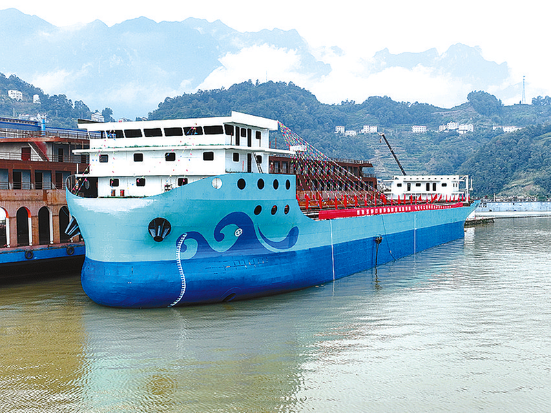 万吨级纯电动散货船在湖北宜昌下水舾装