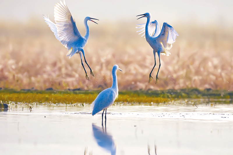 河湖岸边水清岸绿,群鸟翩跹,勾勒出人水和谐的生态画卷。