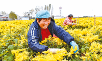 11日,在上蔡县重阳菊农业的种植基地里,农户正娴熟地采摘成熟的花朵,田间地头一派繁忙的丰收景象。今年,该种植基地共种植菊花200多亩,预计亩产量2000斤左右。小小的菊花已成为当地带动农民增收的“金色产业”。(记者 弓华静 耿杨扬)