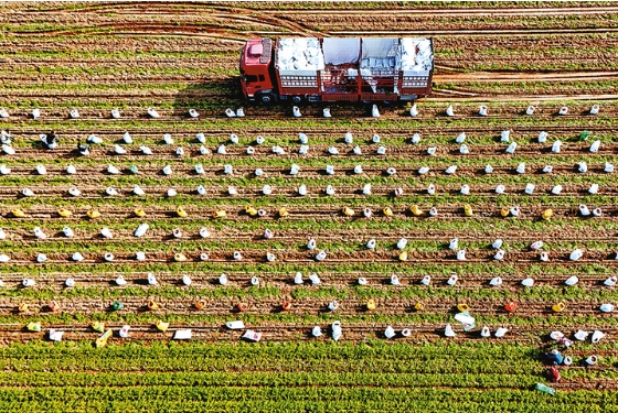12月7日,河南省开封市尉氏县张市镇张市村特色种植合作社的员工在种植园采收(无人机照片)。