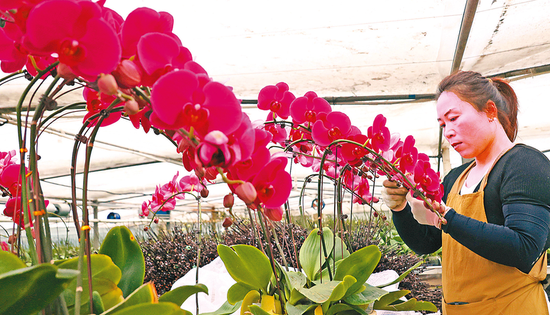 12月23日,在江苏省连云港市农商控股集团农业科技公司花卉大棚,工作人员对蝴蝶兰进行组盆。新年将至,各地迎来年宵花销售高峰,生产企业按照订单管护、外运各类花卉,供应节日消费市场。