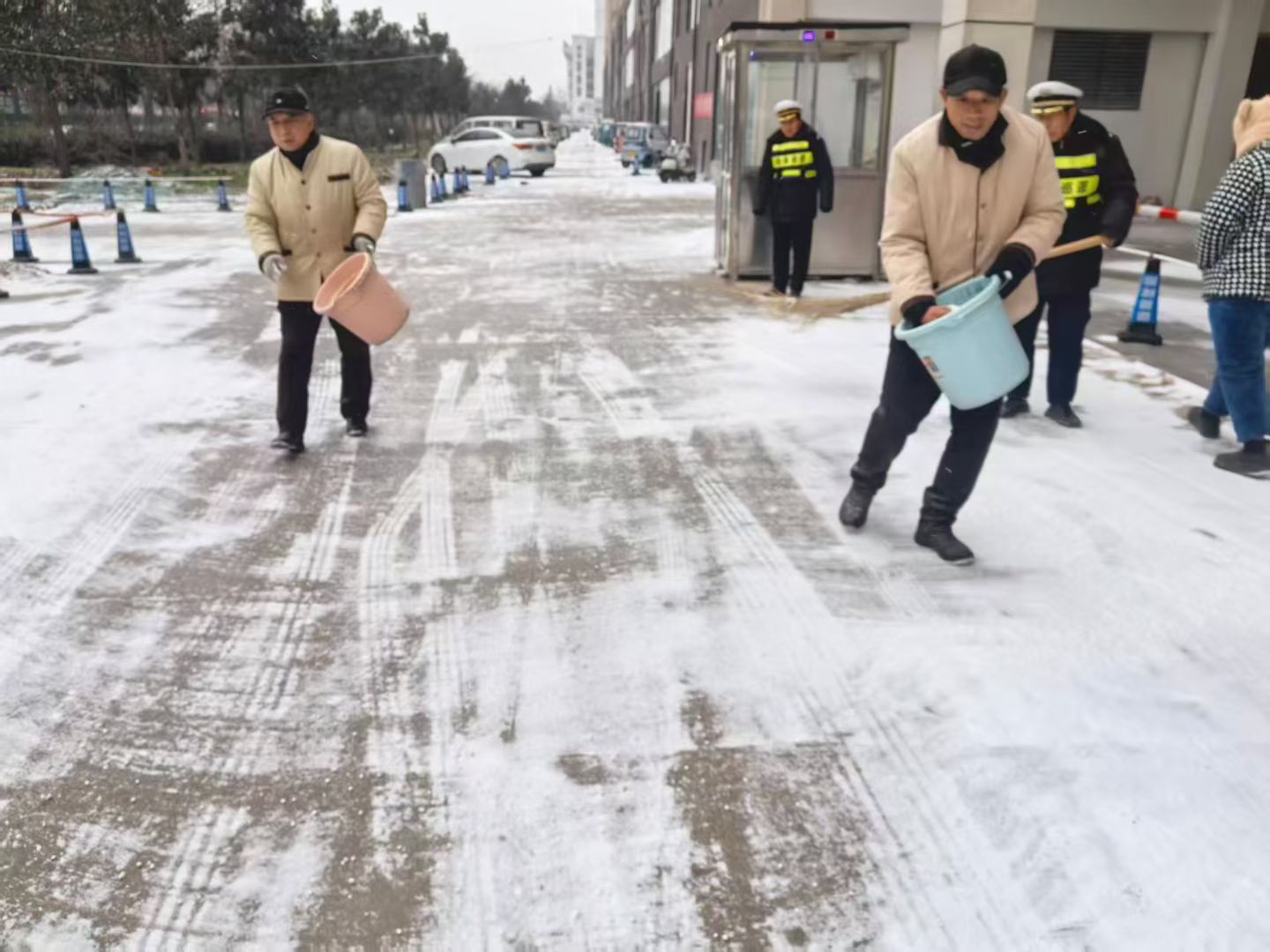 现场,客服,维修,保洁,安保人员手持雪铲、铁锹,重点攻坚单元门口、人行步道、停车场出入口等区域。他们不仅清除积雪,更仔细撒布融雪剂与防滑垫,防止路面结冰,有效保障了服务小区主要通道、各单元门连接路段已基本畅通,确保了早高峰时段居民的安全出行。