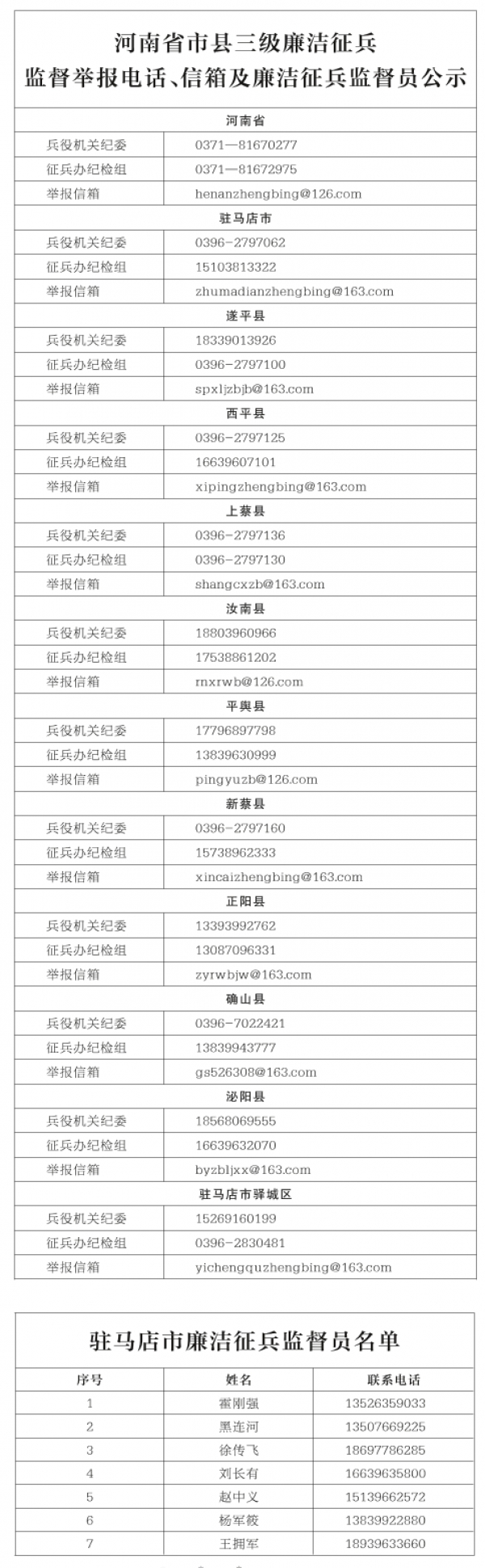 - 河南省市县三级廉洁征兵监督举报电话、信箱及