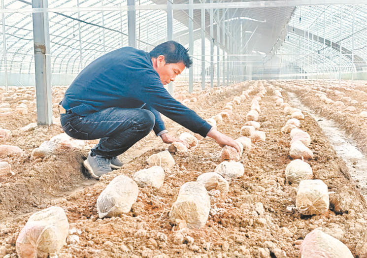 基地内,14个标准化种植大棚整齐排列,大棚内,技术员正蹲在菌垄间,仔细查看土壤湿度与菌丝生长情况,小心翼翼地对刚刚破土而出的幼嫩菌芽进行精心管护。