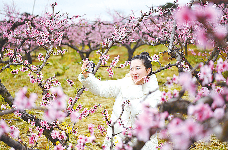 3月16日,游客在贵州省贵阳市南明区永乐乡万亩桃园内拍照打卡。新华社发