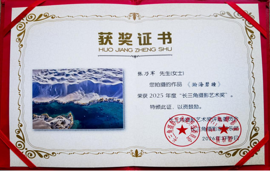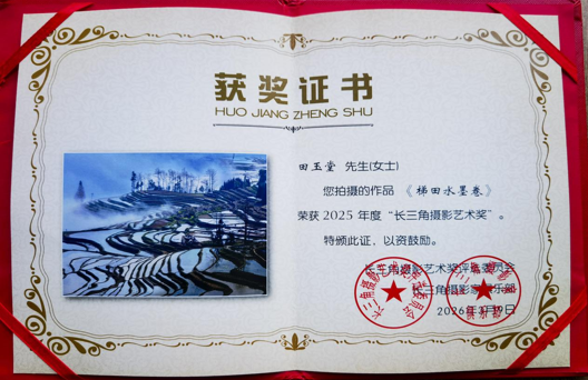 近日,2025年度长三角摄影艺术奖评选结果正式揭晓,驻马店市摄影人表现亮眼,其中吴忠富(作品:冬之序曲)、张乃军(作品:瀚海碧瞳)、田玉堂(作品:梯田水墨卷)三位摄影家凭借优秀作品成功获奖,为天中摄影界再添殊荣。