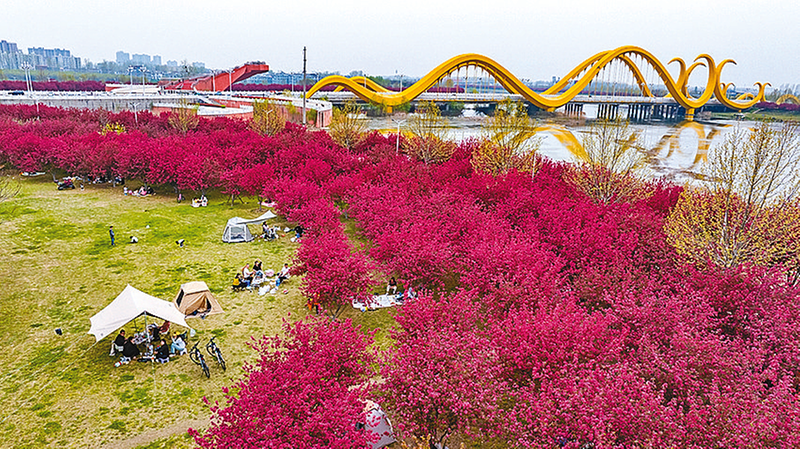 3月29日,西平县小洪河与嫘祖河两岸海棠花进入盛花期。绵延的花海如云似霞,吸引大批市民前来踏青赏春。花树下,有人铺开餐垫露营休憩、有人身着盛装拍照打卡,在烂漫春光中享受惬意的时光。