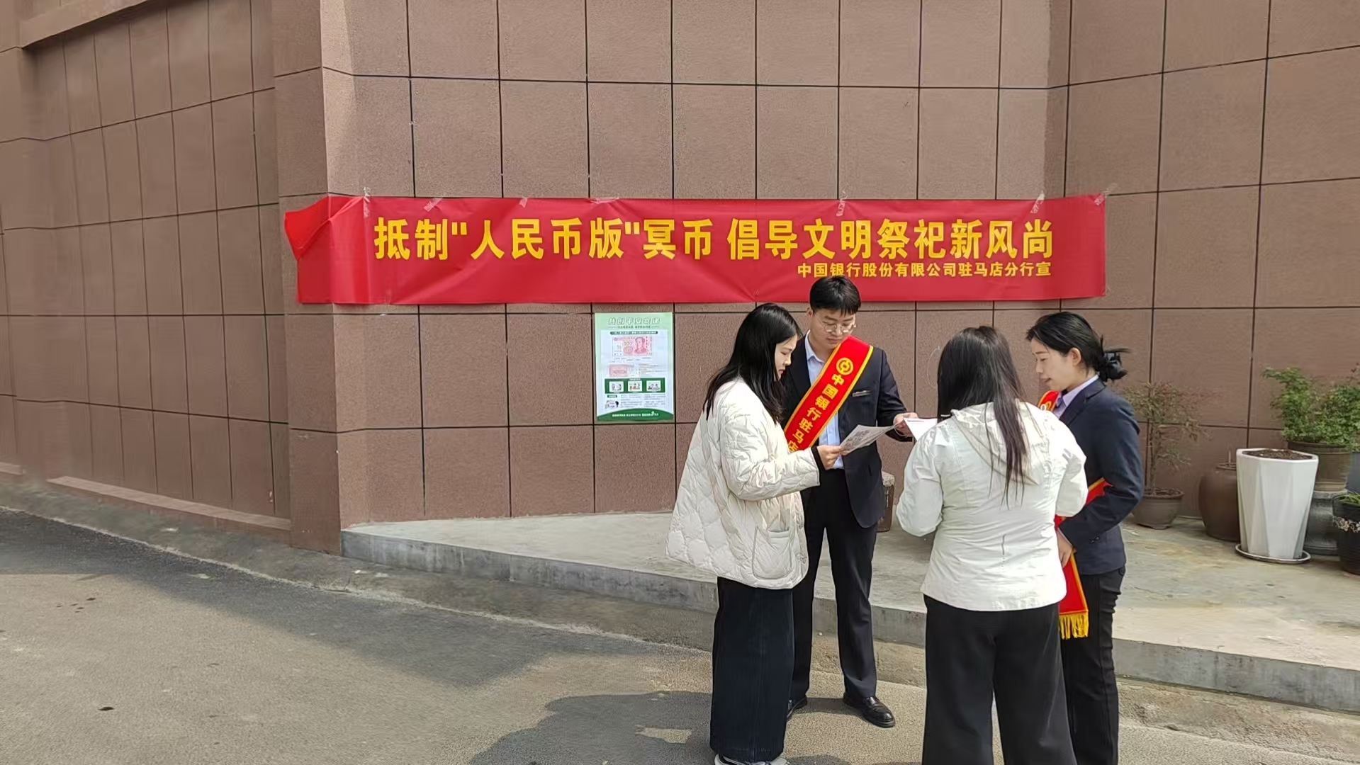 为扩大宣传覆盖面、提升群众知晓度,人民银行驻马店市分行多措并举、协同发力。联合市场监督管理局发布文明祭扫倡议书,倡导鲜花祭扫、网络祭扫等绿色低碳方式,引导群众自觉抵制“人民币版”冥币。组织全市银行业金融机构同步开展宣传,依托网点电子屏滚动播放警示标语、悬挂宣传横幅、摆放专题展板,营造“爱护人民币、抵制违规冥币”的浓厚氛围。组织金融志愿者走进社区、乡村,面对面宣讲人民币图样管理规定,普及违法违规行为法律后果,让法治观念与文明理念深入人心。