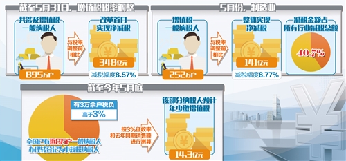 记者从国家税务总局获悉,截至5月31日,增值税税率调整共涉及增值税一般纳税人895万户,与税率调整前相比,改革首月实现净减税348亿元,减税幅度8.57%。