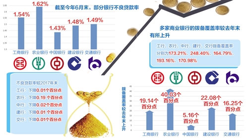 从已发布的中报看,上市银行资产质量保持稳定。截至今年6月末,五大行的不良贷款均较2017年末下降,部分股份行出现了不良贷款余额、不良贷款率“双降”。同时,多家银行的拨备覆盖率有所上升,风险抵补能力进一步增强。