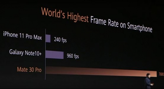 发布会现场,余承东将Mate30 Pro与目前其他品牌旗舰手机对比。iPhone 11 Pro Max仅支持240帧慢动作,三星Galaxy Note 10+支持960帧慢动作,而Mate30 Pro支持7680帧超慢速拍摄。