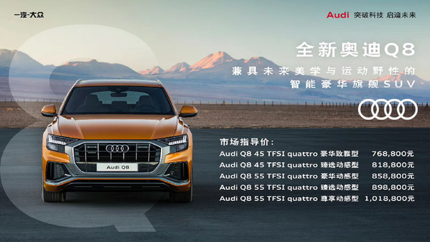 一汽-大众奥迪销售事业部执行副总经理荆青春说:“诞生于‘新豪华时代’的‘新旗舰’奥迪Q8,必将为‘新精英’用户群体带来前所未有的出行体验,成为豪华旗舰SUV细分市场当之无愧的标杆车型。”