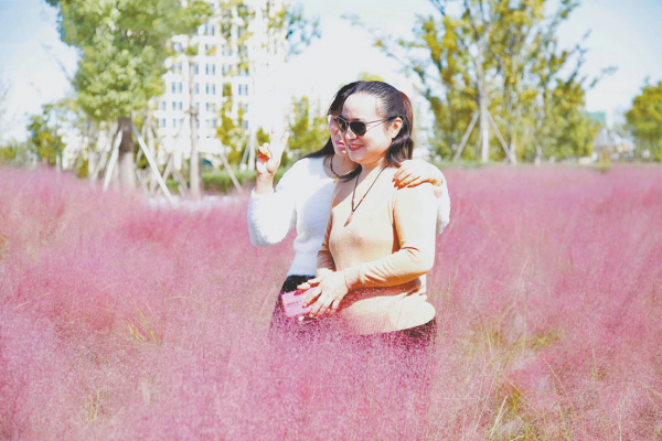 人民公园粉黛乱子草的设计呈梯田状,走在花田里的水泥小路上,紫红色云雾状的花穗随风摇曳,仿佛置身于粉红色的海洋中,如诗如画。