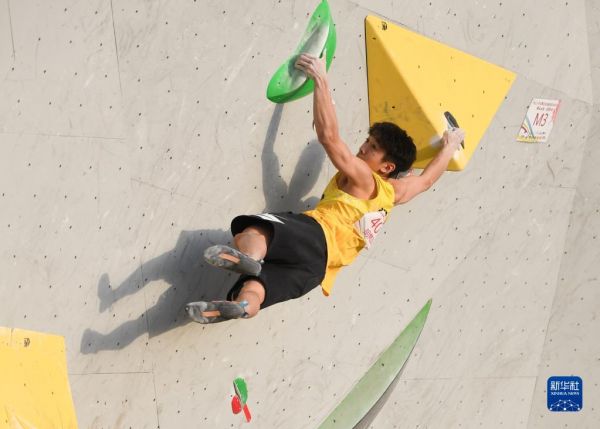 4月9日,陈勇辰在男子两项全能决赛(攀石)项目比赛中。新华社记者 程 敏 摄