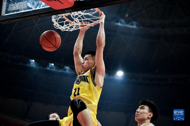 10月29日,吉林九台农商银行队球员吴昌泽(左)在比赛中扣篮。新华社记者 许畅 摄