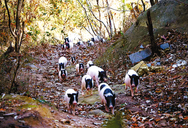 老关庄村南岗的小溪边有一片开阔的灌木林,是小香猪散养基地。小香猪在那里渴了喝溪水,饿了拱食野草、野菜、中药材根茎。