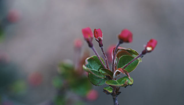 看,海棠园门口的“贴梗海棠”已迫不及待了,一株株贴梗海棠树形清瘦遒劲,枝干矫健,枝丫横斜,一朵朵艳阳红花紧贴枝干,花蕊浓黄,簇簇挺立,透出敢为天下先的骄傲倔强。红花灼烁,似火如血。蓦地让人明白,贴梗海棠的花语为何是“伟大、热忱、先驱者”。
