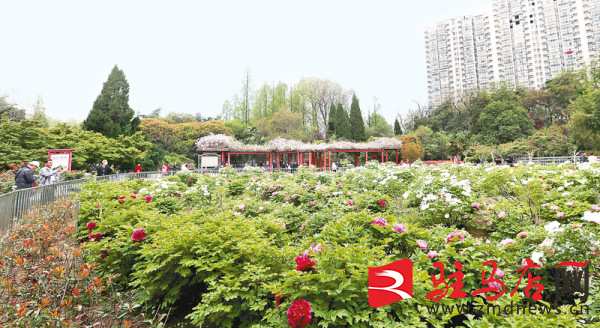 4月7日,在驻马店市南海公园东西两院引种的魏紫、姚黄、赵粉、豆绿等牡丹陆续盛开,引得不少市民驻足观赏、拍照留念。