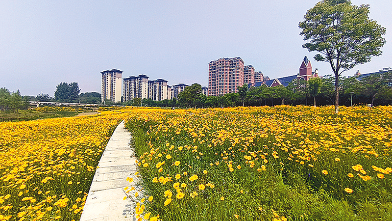 盛开的金鸡菊,吸引了蜜蜂、蝴蝶在花海中飞舞。不少市民徜徉在花海中拍照打卡,一朵朵花盘宛如小小的太阳,微风吹过,花朵迎风摆动,花田泛起金色波浪,与远处连绵的群山、湛蓝的天空、洁白的云朵交相辉映,一片生机勃勃、灿烂辉煌的景象。