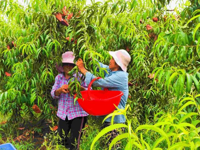 套袋里面包裹的是一个个外形圆润、皮薄多汁、色泽金黄的黄桃。村民正在麻利地采摘成熟的桃子,不一会儿便装满了一筐。他们虽然满头大汗,但脸上洋溢着收获的喜悦。