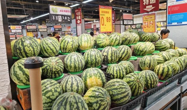 “随着气温升高,西瓜、桃子、甜瓜等应季水果逐渐上市,但销量最大的要数西瓜。”超市工作人员介绍,由于最近天气越来越热,市民对这种消暑类产品的需求正在加大,因此西瓜的销量也在不断增加。“对比去年的价格,今年爱吃瓜果的群众真是有口福。今年水果价格整体走低,以甜王西瓜为例,去年7月份价格才低至1元多一斤,今年提前一个月就已经卖到同等价位。”这名工作人员表示。