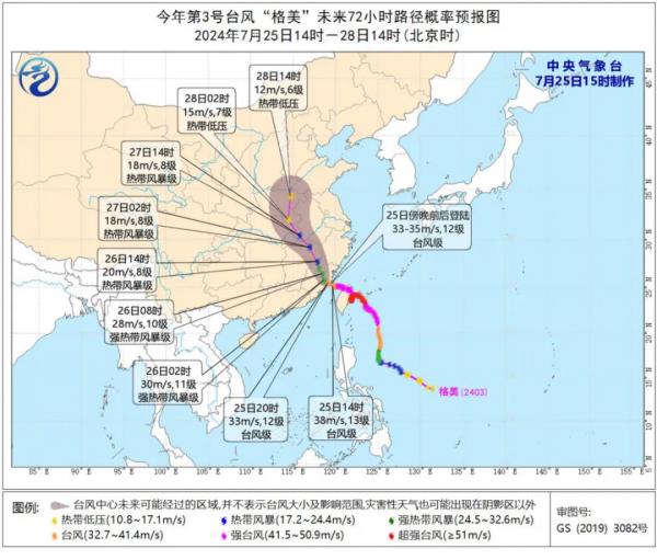 今年第3号台风“格美”的中心25日15时在距离福建省福清市南偏东方向约75公里的海面上,强度为台风级,中心气压965hPa,最大风力13级(38米/秒)。