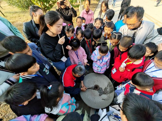 一路参观一路讲解,不一会儿孩子们来到石磨处,亲身体验芝麻在石磨的碾磨下变成了“糊糊”,同时还能收获自己的劳动成果。