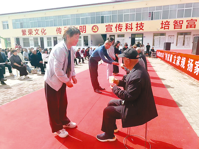 在世代孝道传承仪式环节,出山镇28户“传家训立家规扬家风”好家风好家训家庭分三组完成“敬茶承训”传承仪式。
