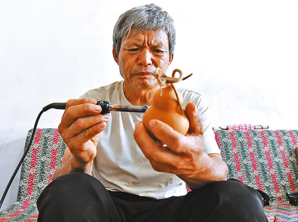 二十世纪九十年代,他在嵖岈山风景区摆起葫芦摊。游客围拢过来后,他左手转葫芦,右手持烙笔,“喜上眉梢”“年年有余”“马到成功”“十二生肖”“竹林七贤”等纹样,转眼便活灵活现地出现在葫芦上。