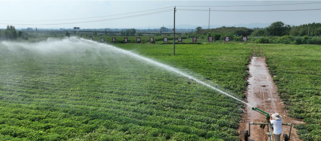 连日高温少雨,导致竹沟镇6.3万亩玉米、花生等关键秋粮作物普遍缺水,生长面临严峻挑战。白晶种植的400亩花生,正是这场旱情的缩影。面对危机,他依托镇政府紧急协调竹沟水库挖渠引水,已成功实施两次关键灌溉。“这两次水来得太及时了,有效保住了苗情,大大减少了损失!”白晶一边查看喷灌情况,一边对记者说。