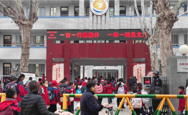 驻马店市实验小学门口,同学们身着校服、佩戴红领巾,有序步入校园。护学岗值守到位,文明宣传标语醒目亮眼,处处彰显文明校园新风尚。大家带着新春的喜悦与期待,精神饱满、笑容灿烂,互叙假期趣事,校园里洋溢着蓬勃朝气。