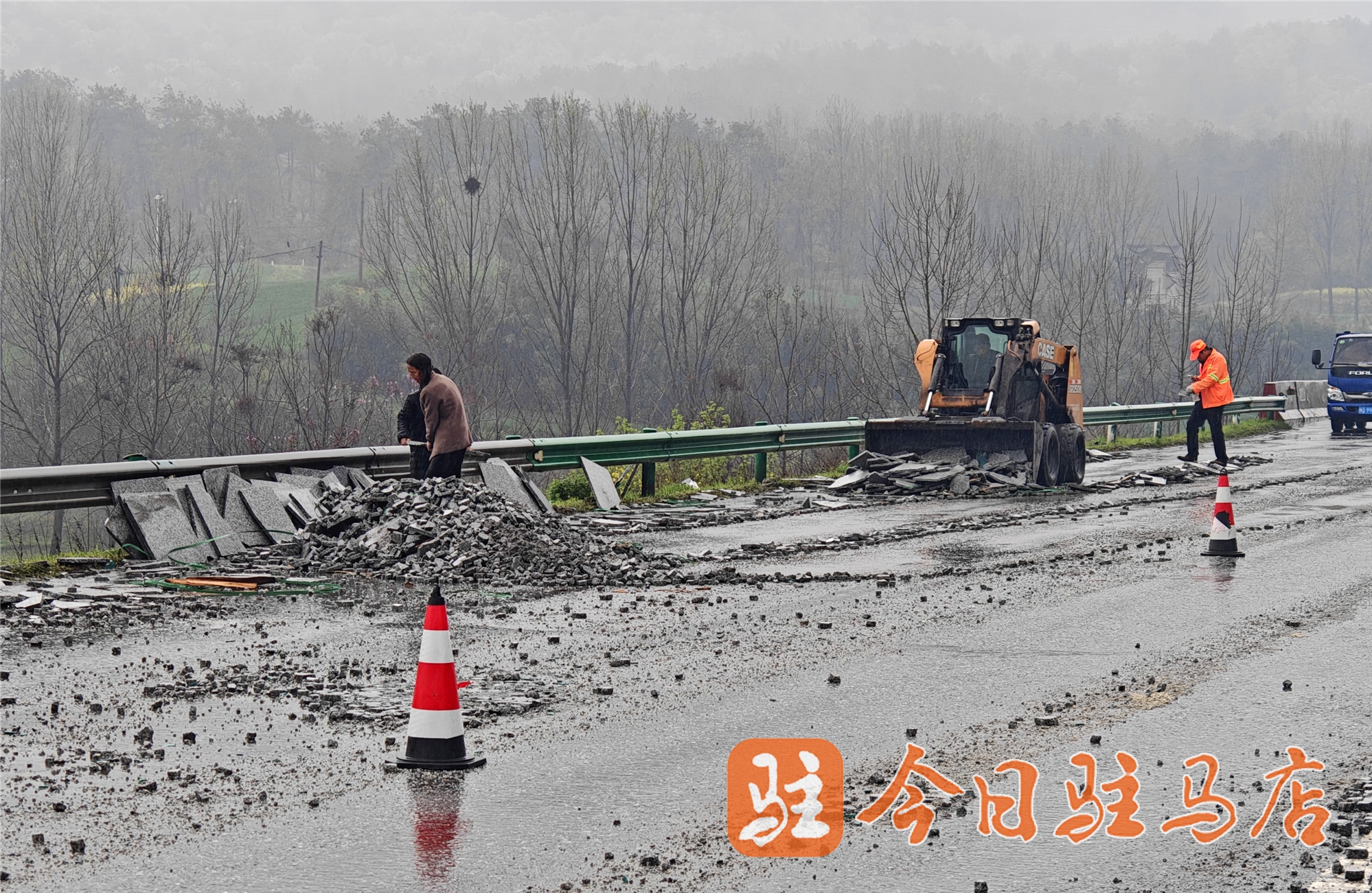 3月30日,驻马店市国道107确山县溢洪道桥附近发生一起货车交通事故,一辆装载石板的货车突发侧翻,车上大量石板倾泻而下,散落在路面占用通行车道,造成该路段交通受阻,过往车辆无法正常通行,给群众出行带来不便。