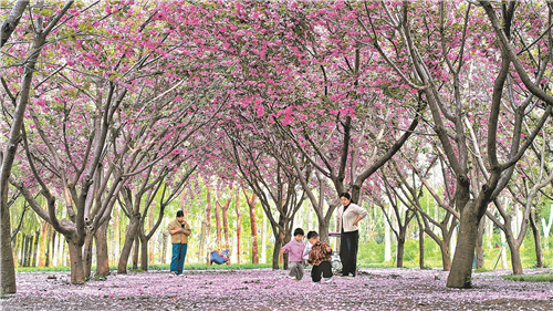 4月12日,柘城县千树园公园樱花盛放,粉樱缀满枝头,游人漫步赏花,孩童在花下嬉戏。 张子斌 摄